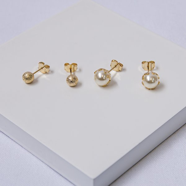Brinco Folheado a Ouro Pérola 8mm e Bola Fosca 6mm Kit 2 Pares