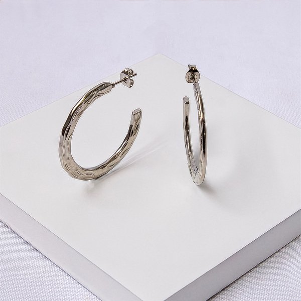 Peça produzida em aço inoxidável de alta resistência, acabamento prateado premium, design trabalhado e formato meia argola média para um visual elegante e atual.