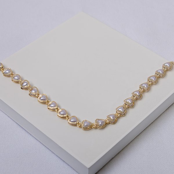 Folheado a ouro de alta qualidade, hipoalergênico e com pérolas em formato de coração que adicionam um toque romântico ao visual. Fecho seguro e extensor ajustável para melhor conforto.