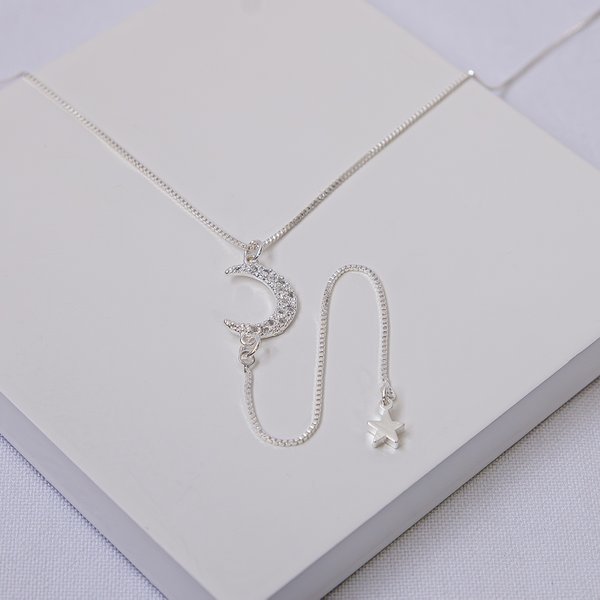 O Colar Choker folheado a prata da Ralifla Semijoias combina a delicadeza da malha veneziana com o charme do pingente de meia lua cravejada e estrela. Um acessório moderno e sofisticado, ideal para valorizar qualquer look feminino.