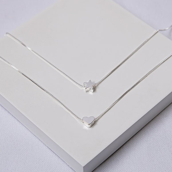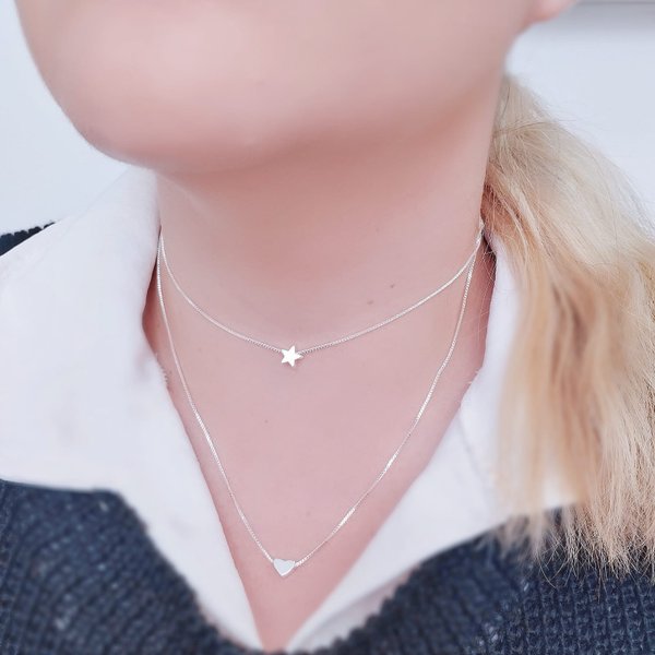 O Colar Duplo Folheado a Prata Estrela e Coração é uma joia delicada e sofisticada, com duas correntes que trazem um pingente estrela na corrente menor e um coração na corrente maior. Perfeito para mulheres que amam acessórios elegantes, modernos e hipoalergênicos.