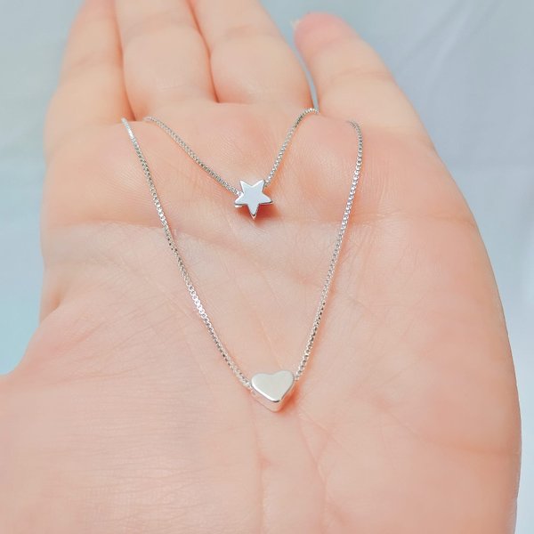 Colar Duplo Folheado a Prata Estrela e Coração