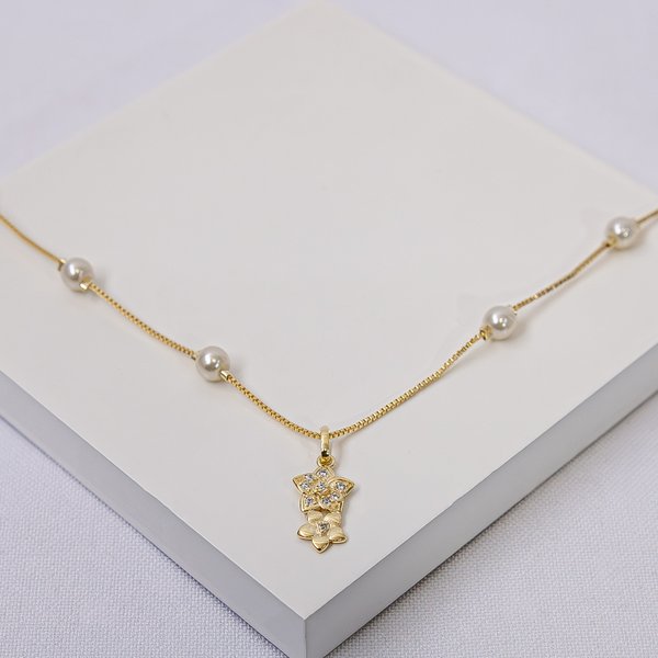 Colar Folheado a Ouro Pérolas e Flores com Zircônias