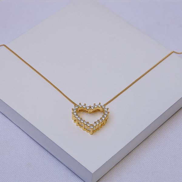 Produzido com banho de ouro de alta qualidade, possui acabamento refinado, corrente veneziana resistente e pingente em formato de coração vazado cravejado com zircônias cristal, garantindo brilho intenso e sofisticação.