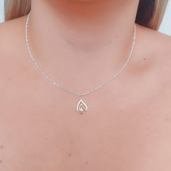 Colar Folheado a Prata Malha Singapura com Pingente Gota Vazado de Zircônias