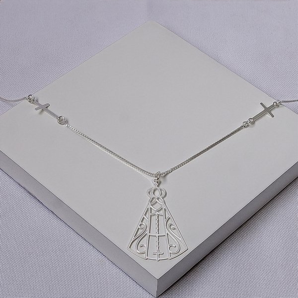Folheado a prata com acabamento refinado, brilho duradouro e detalhes vazados cuidadosamente trabalhados no pingente de Nossa Senhora Aparecida.
