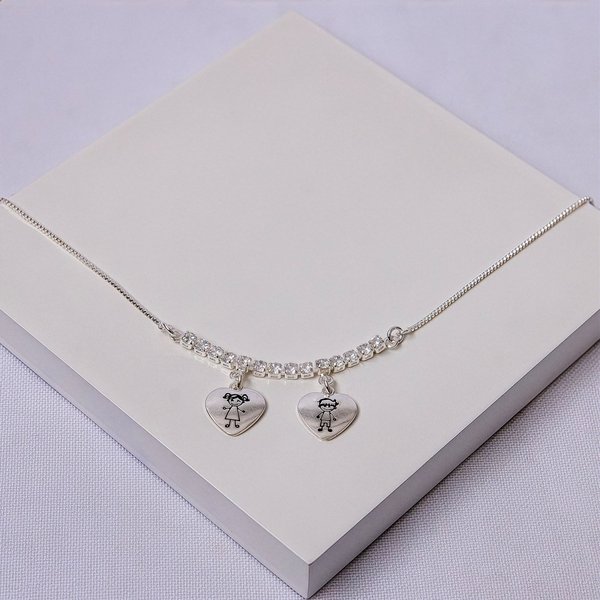 O colar folheado a prata da Ralifla Semijoias é uma joia delicada e cheia de significado. Possui malha veneziana com zircônias e pingentes em formato de coração com menina e menino, ideal para representar o amor materno de forma elegante e atemporal.