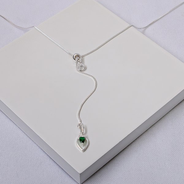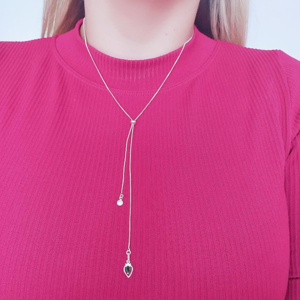 Colar Gravata Feminino Gota Pedra Verde Folheado a Prata