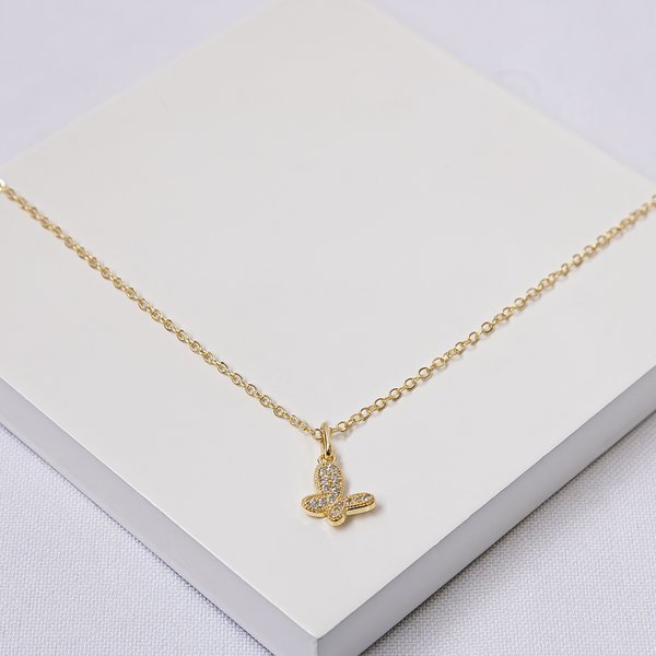 Produzido em folheado a ouro de alta qualidade, hipoalergênico e resistente, com pingente borboleta cravejado em micro zircônias cristal que proporcionam brilho delicado e acabamento refinado.