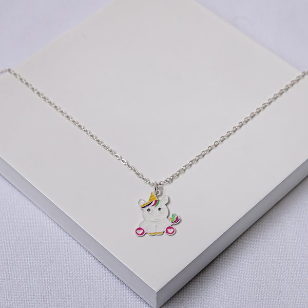 Encante as pequenas com este colar infantil folheado a prata que traz um delicado pingente de unicórnio resinado. Uma joia lúdica, hipoalérgica e ajustável, ideal para meninas que amam acessórios encantadores e divertidos.