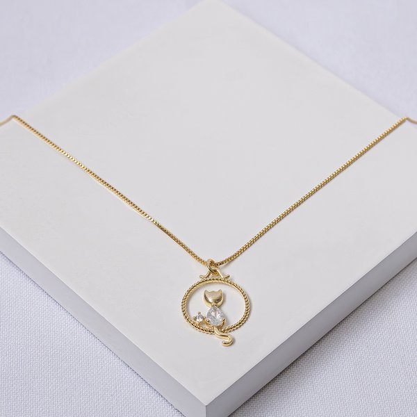 Colar Veneziana Folheado a Ouro Pingente Gato com Zircônia