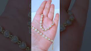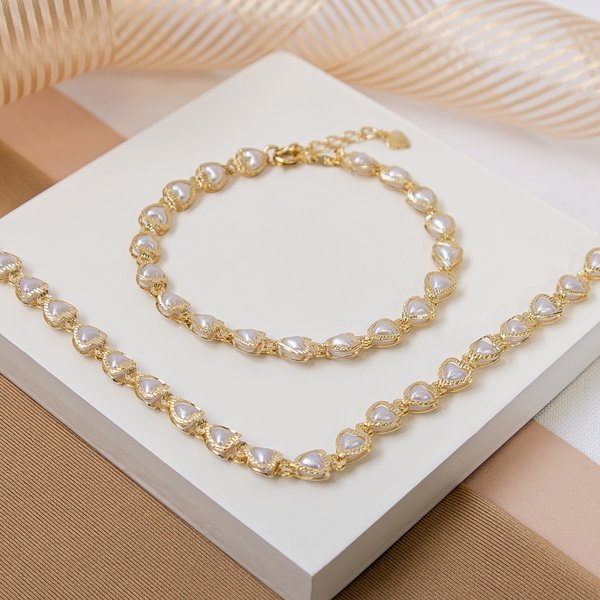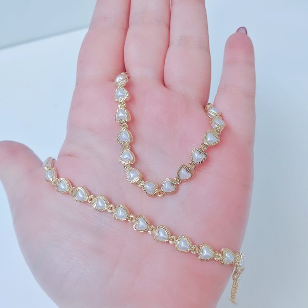 Esse conjunto é um verdadeiro charme! O mix da choker e pulseira com pérolas em formato de coração, folheadas a ouro e com acabamento diamantado, entrega romantismo e sofisticação na medida certa. Ideal para quem ama composições delicadas e estilosas com aquele brilho que transforma o visual.