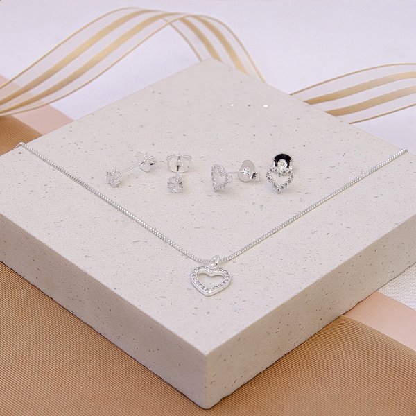 Conjunto Colar e Brincos Feminino Prata Coração Cravejado