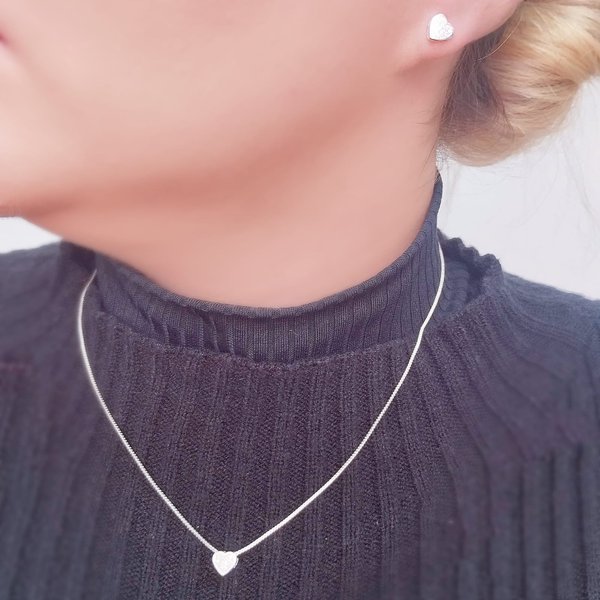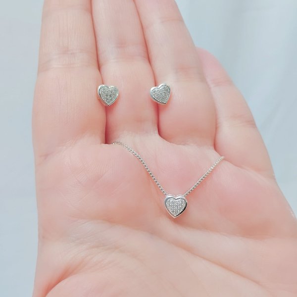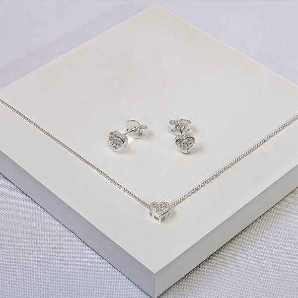 Conjunto Feminino Folheado a Prata Coração Cravejado com Zircônias