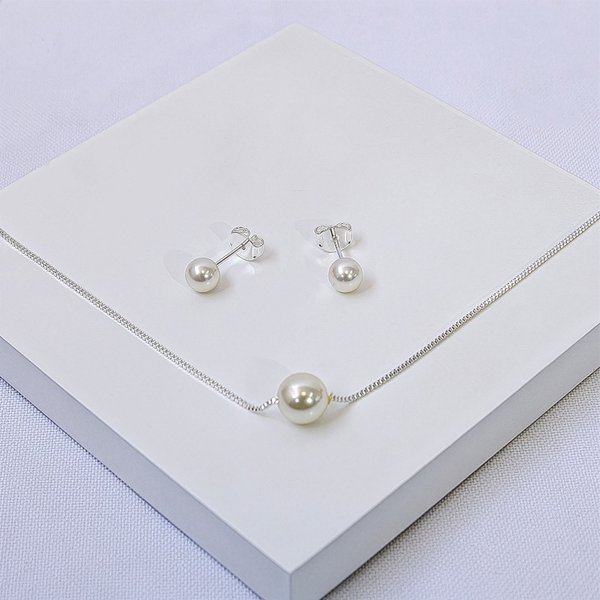 Peças folheadas a prata de alta qualidade, com banho antialérgico e acabamento brilhante. O colar estilo veneziana com pingente de pérola e o brinco delicado formam uma combinação harmoniosa e atemporal.