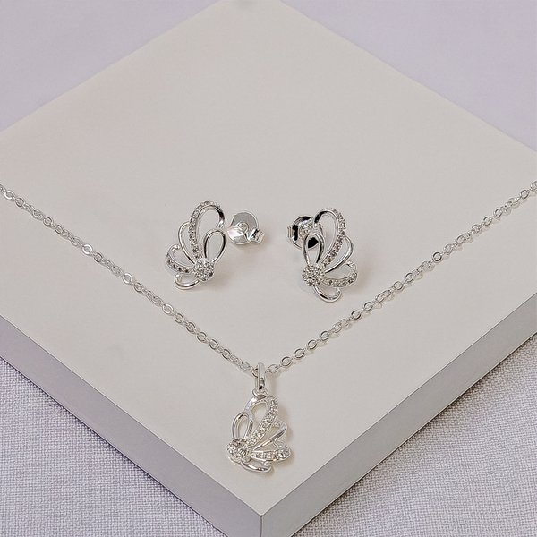 Produzido com banho de alta qualidade em prata, o conjunto apresenta brilho duradouro e excelente acabamento. As peças contam com detalhes cravejados que acrescentam elegância ao visual, além de serem hipoalergênicas e livres de níquel.