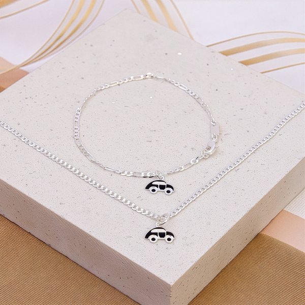 O conjunto infantil folheado a prata da Ralifla Semijoias é perfeito para meninos que gostam de acessórios delicados e cheios de estilo. Com corrente e pulseira finas, ambas com pingente de carro, é ideal para presentear com charme e significado.