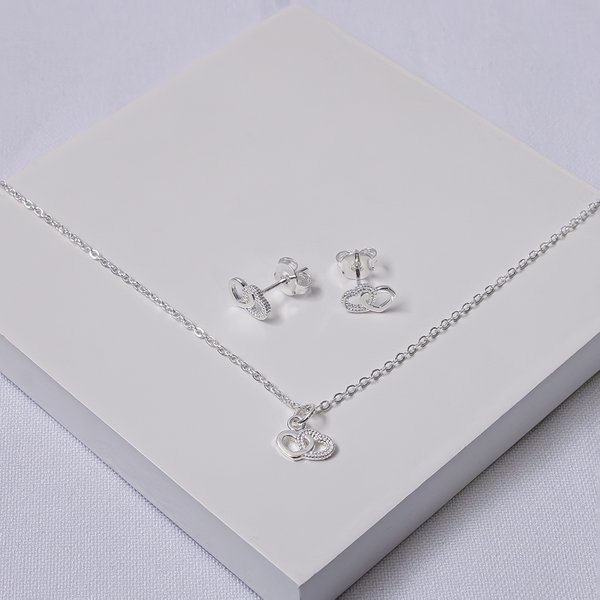 Conjunto Infantil Folheado a Prata Colar e Brinco Corações Entrelaçados