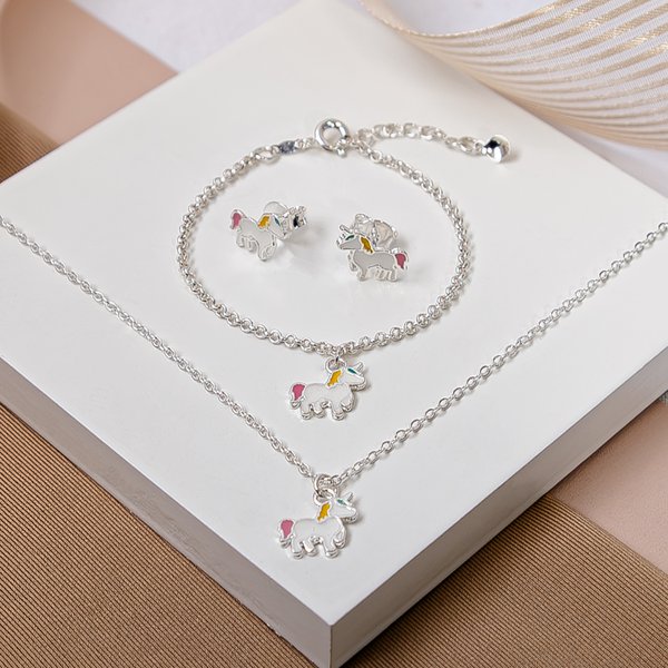 Conjunto Infantil Unicórnio Folheado a Prata com Pulseira, Colar e Brinco