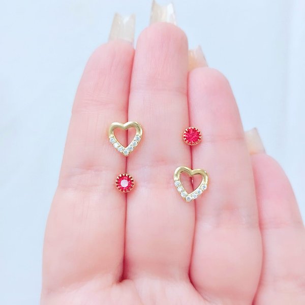 Dupla de Brincos Folheado a Ouro Coração Vazado com Zircônias e Cristal Vermelho