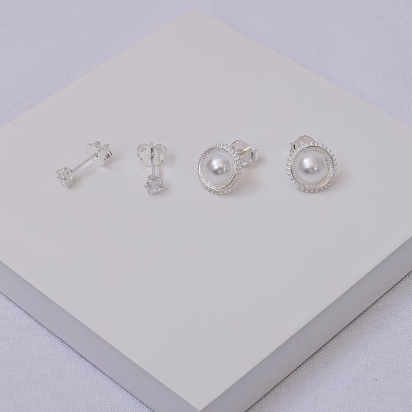 Dupla de Brincos Folheado a Prata Meia Pérola e Coração