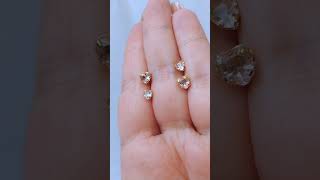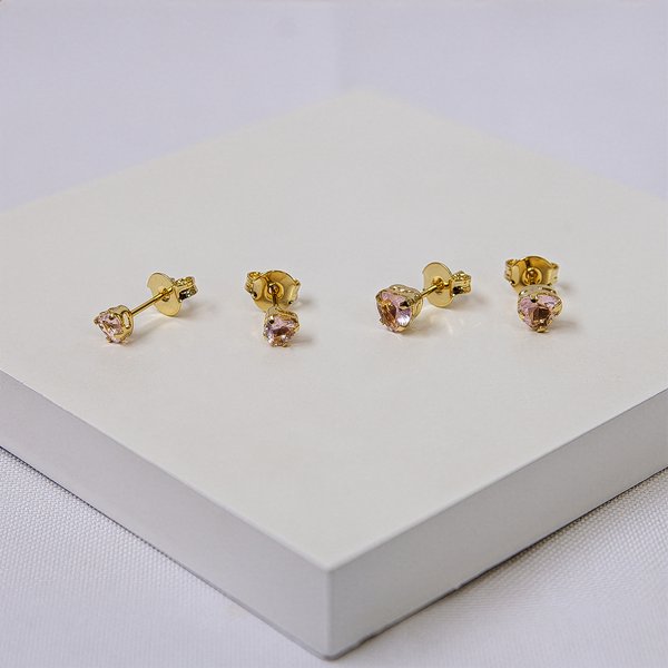 Dupla de Brincos Infantis Folheados a Ouro com Cristal Rosa Coração