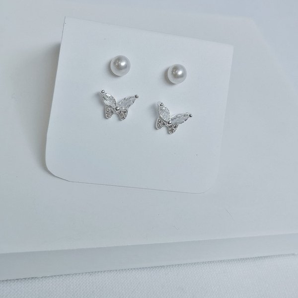 Dupla de Brincos Infantis Folheados a Prata Pérola e Borboleta Cravejada