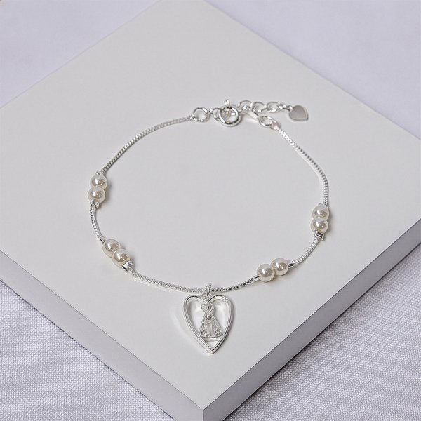Pulseira feminina delicada com pérolas pequenas e pingente de coração vazado com Nossa Senhora Aparecida. Ideal para quem busca um acessório elegante, moderno e com significado, unindo fé e estilo no dia a dia.