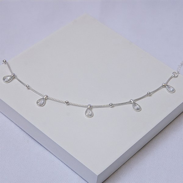 [Peça folheada a prata de alta qualidade, com acabamento refinado e polido. Possui malha veneziana resistente, bolinhas decorativas e zircônias em formato de gota pendente que proporcionam brilho e sofisticação ao visual.]