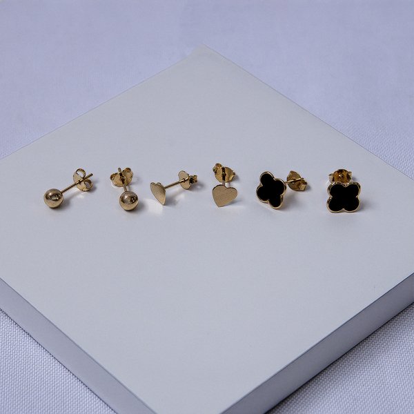 O trio de brincos folheado a ouro com coração, bolinha lisa e trevo preto é perfeito para quem busca delicadeza, significado e versatilidade. Um conjunto feminino que permite combinações modernas e elegantes para o dia a dia.