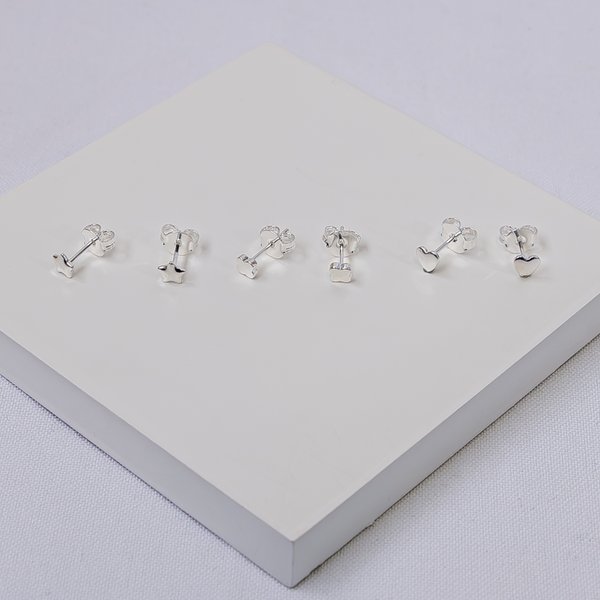 Trio de Brincos Pequenos Coração Estrela Trevo Folheado Prata